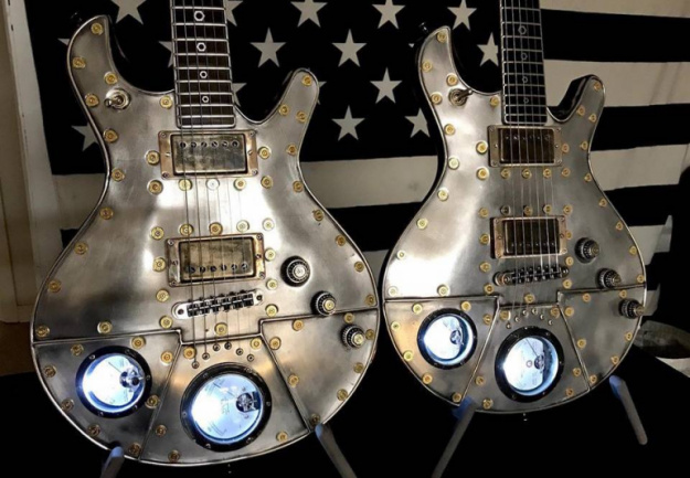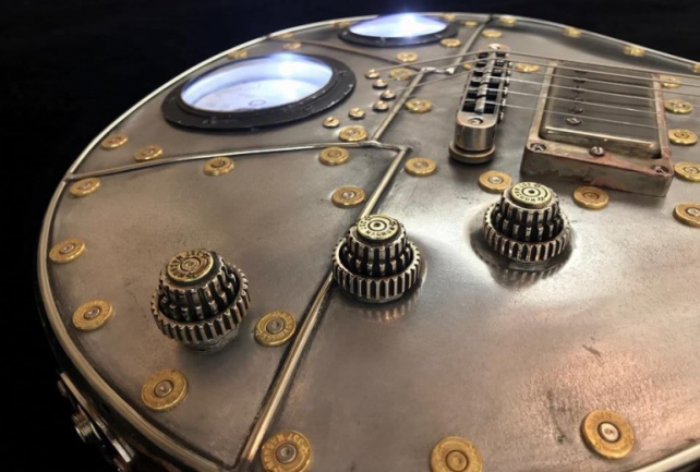 Ahora el luthier Stephen McSwain ha anunciado una tirada de menos de 10 unidades de la Machine Custom (dos van camino del mercado japonés y 6 se venderán en varios distribuidores de EEUU). Una guitarra con estética Steampunk que parece salida de una novela de Julio Verne con ese frontal de aluminio, los remaches hechos con casquillos de bala Magnum .357, los vúmetros, o las tapas de los potenciómetros con forma de engranajes.