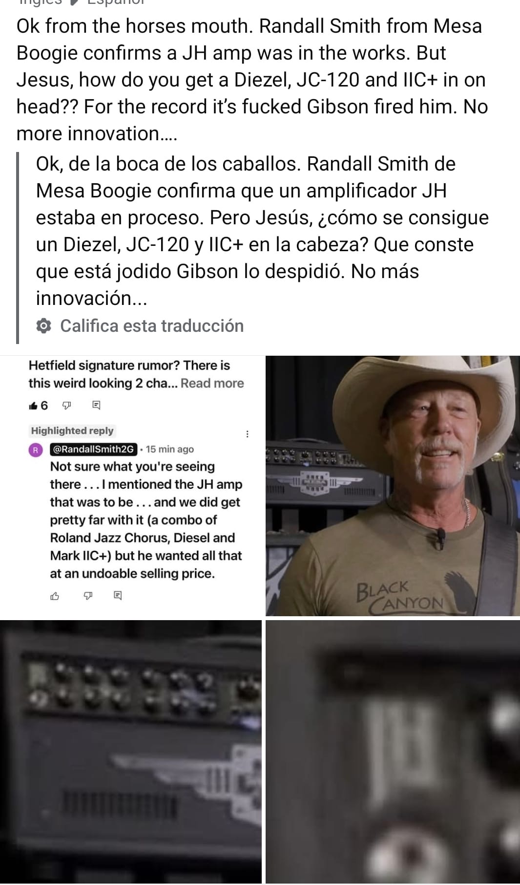 "No estoy seguro de qué es lo que estáis viendo... yo mencioné el amplificador JH [James Hetfield Signature] que quedó por hacer... y llegamos bastante lejos con él (era una combinación de un Roland Jazz Chorus, un Diezel y un Mark IIC+), pero él quería todo eso a un precio de venta que no era realista".