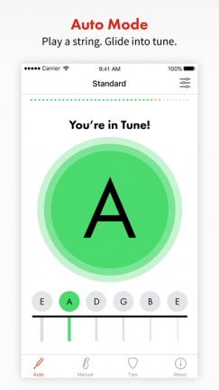 Según Fender, se trata de un afinador apto tanto para usuarios más avanzados como principiantes, ya que combina una alta precisión y opciones de customización con numerosos consejos en pantalla que dan indicaciones sobre cómo afinar y explican el significado de expresiones como “afinador cromático”. El número de afinaciones alternativas entre las que podemos escoger asciende a 22 (más las afinaciones personalizadas que guarde el usuario) y es posible utilizar el modo automático (el afinador capta la cuerda que hemos tocado y nos muestra su estado de afinación) y el manual, en que la aplicación emite un sonido pregrabado de cómo debería sonar cada cuerda cuando pulsamos sobre el clavijero interactivo (muy útil para aquellos casos en que los principiantes tienen las cuerdas considerablemente desafinadas y el modo automático puede dar resultados confusos). También es posible entrar en el modo cromático, donde simplemente podemos afinar cada cuerda con la nota que escojamos.