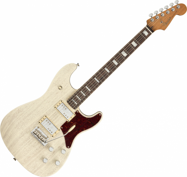En el cuerpo, con un atractivo acabado Static White translúcido que deja ver la veta de la caoba, conviven un golpeador estilo Tele Cabronita, el clásico vibrato Strtatocaster Synchronized con selletas curvadas de acero, y un par de humbuckers Fender Custom Double Tap con el selector de palanca de 3 posiciones en el cuerno superior y potenciómetros de volumen y tono para cada una.