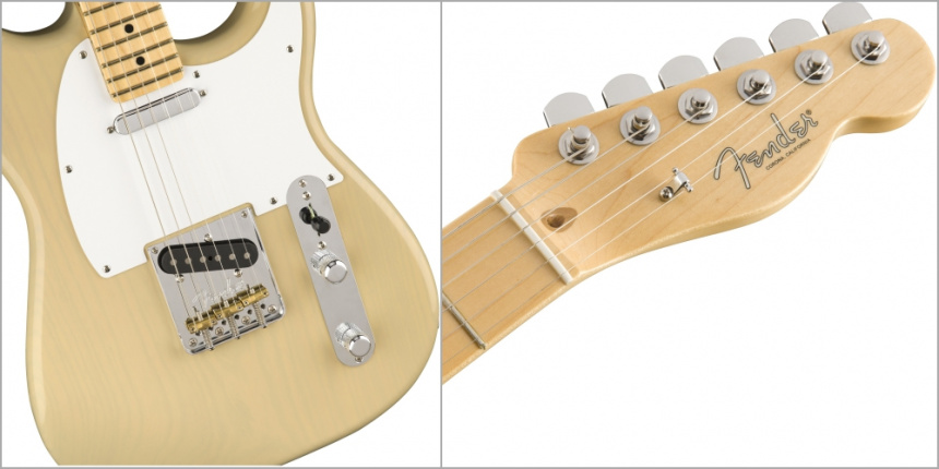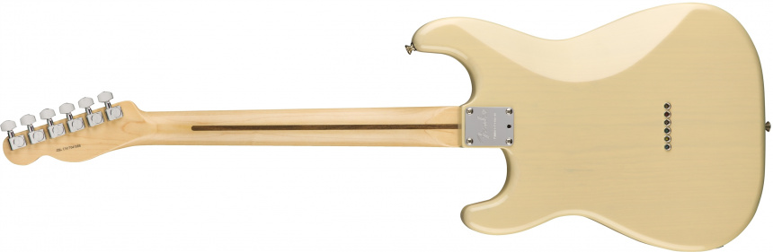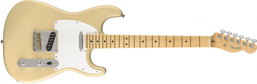 Esta vez tenemos un cuerpo Strato de Fresno con acabado Vintage Blonde, en el que han implantado todos los elementos de una Telecaster; incluyendo el golpeador, los controles, el puente con 3 selletas compensadas de Latón, y un par de single coil Custom Shop '51 Nocaster.