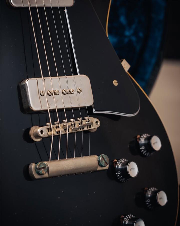 Puente y cordal, así como el resto del hardware también están envejecidos, y las mencionadas pastillas son una Gibson P-90 con el cableado tradicional de volumen y tono independiente para cada una, y un conmutador de 3 posiciones.