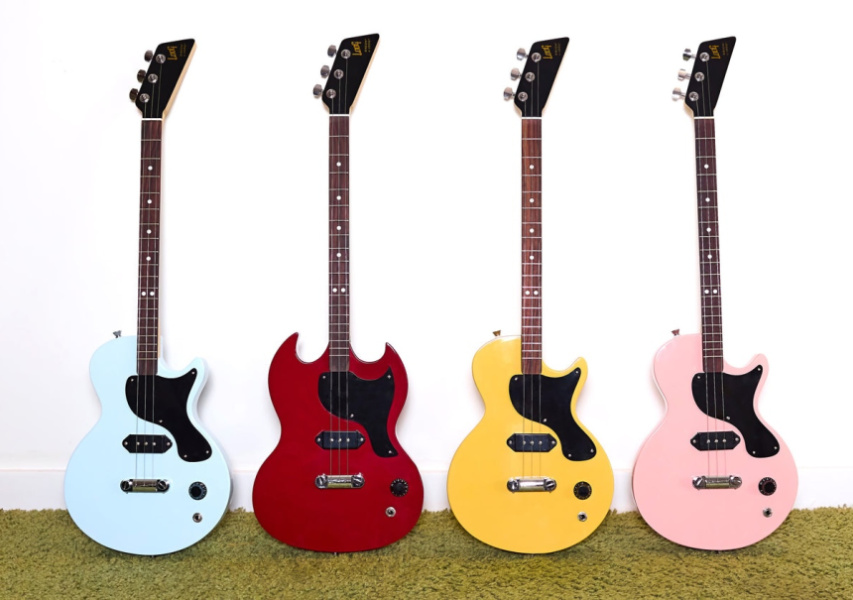En cuanto a las especificaciones; tenemos un cuerpo de álamo tipo Les Paul en 3 colores: TV Yellow, Shell Pink y Frost Blue. O uno estilo SG en Cardinal Red. Todos con un golpeador negro.
