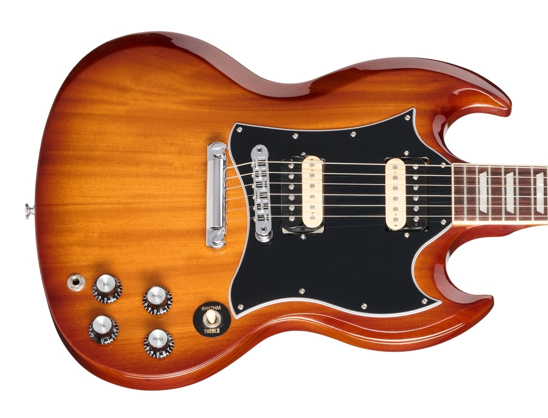 Una guitarra con un cuerpo de caoba en acabado Natural Burst con laca de nitrocelulosa, para reflejar la tonalidad envejecida que ha adquirido su SG durante esta dos décadas, y un golpeador de color negro tipo “batwing” de cinco capas.