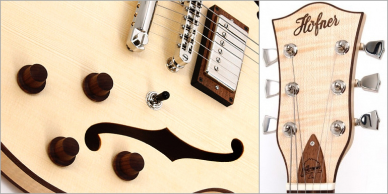 Esto incluye los marcos de las pastillas (unas humbuckers de la compañía alemana Nowaxx fabricadas especialmente para Höfner), los inlays del traste 12, las tapas de los potenciómetros y la que cubre el ajuste del alma, el binding de cuerpo y mástil, o la inserción del logo en la pala que ha sido cortado con láser. Incluso en el acabado de la guitarra se ha empleado una cera respetuosa con el medio ambiente certificada para su uso en juguetes para niños.