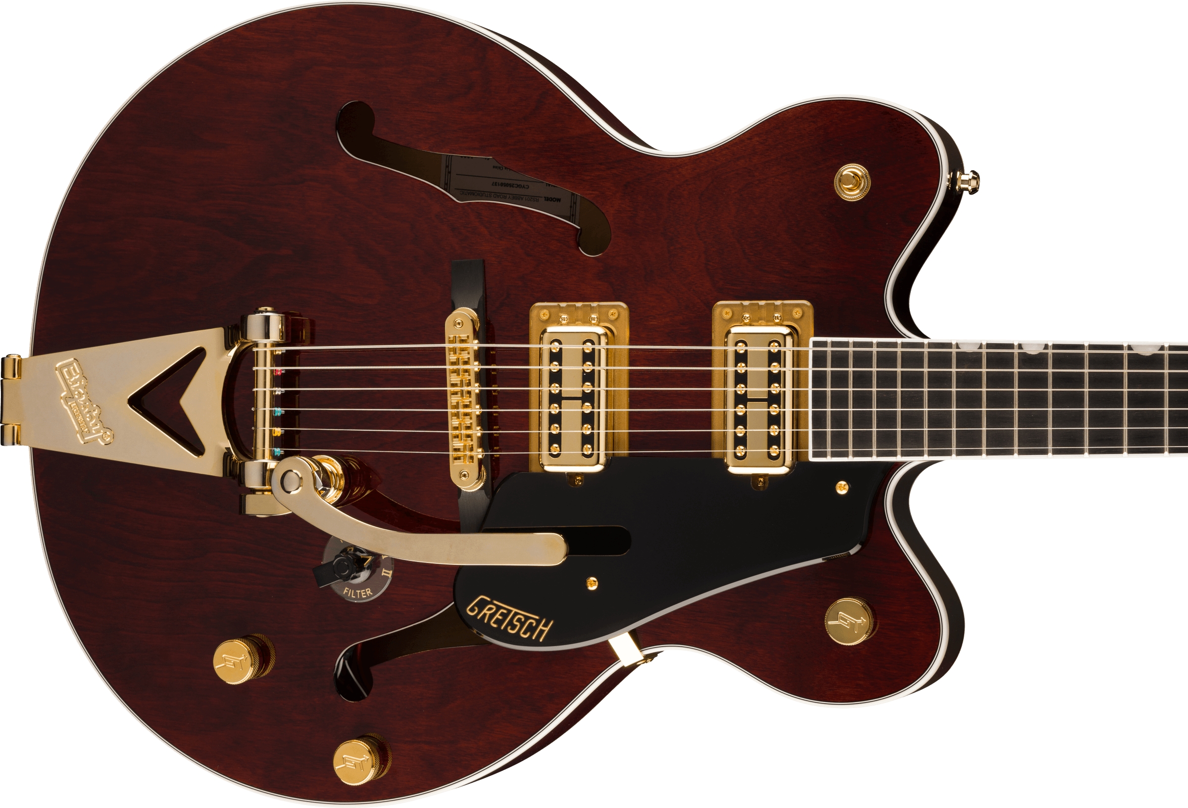 El vibrato, dorado a juego con el resto del hardware, es un Bigsby B60 V-Cutout combinado con un puente Adjusto-Matic sobre una base de ébano.