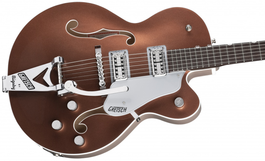 [Índice]Por último, el G6118T Players Edition Anniversary Hollow Body with String-Thru Bigsby, presenta un cuerpo de 16" de ancho y 2.5" de profundidad, con refuerzos ML. El mástil es nuevamente en forma "U", con marcadores perloides laterales, y la escala es de 24.6". El acabado es a dos tonos (Copper Metallic/Sahara Metallic o Vintage White/Walnut Stain), y el precio es de 2.639 euros.