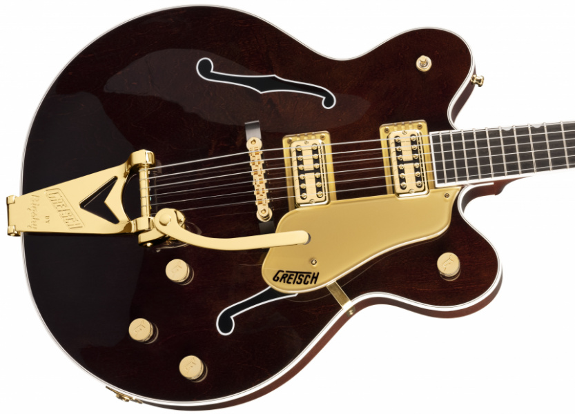 [Índice]El modelo G6122TG Players Edition Country Gentleman Hollow Body with String-Thru Bigsby and Gold Hardware presenta un cuerpo de arce de 2" de profundidad, con refuerzo de tipo Parallel, agujeros en forma de f simulados, y de nuevo los afinadores de bloqueo Grover Imperial. El acabado es el Walnut Stain Gloss, y el precio es de 3.119 euros.
