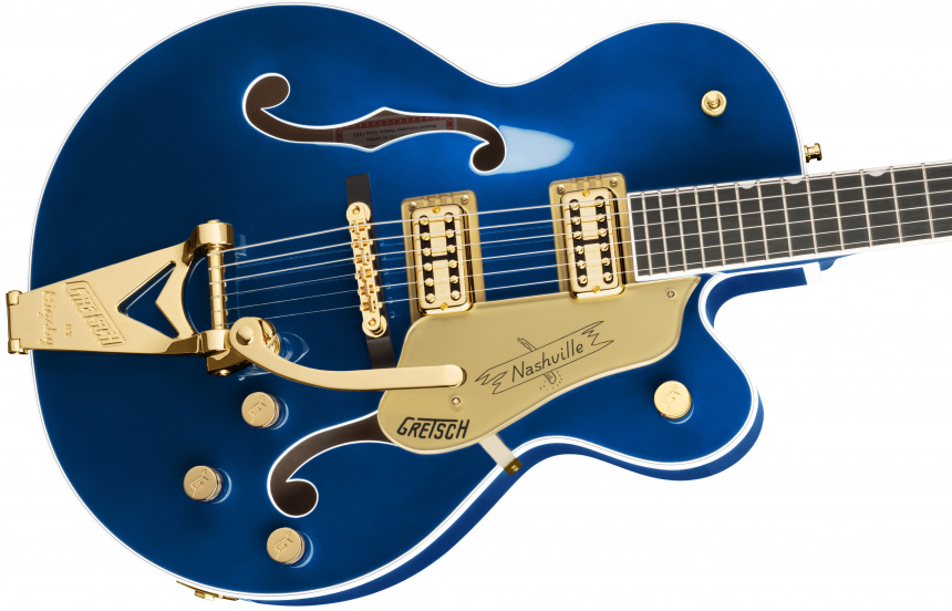 [Índice]Como ocurría con la Falcon, la G6120TG Players Edition Nashville Hollow Body with String-Thru Bigsby and Gold Hardware también tiene versión para zurdos, y tiene una escala de 24.6" y un cuerpo de arce de 2,5" de profundidad y 16" de ancho. El mástil es de arce, con perfil U y nuevamente tiene incrustaciones perloidoes Neo-Classic y refuerzo ML. Los colores disponibles son Azure Metallic o Orange Stain Gloss y su precio es de 3.049 euros. También existe en versión DS, con pastillas DynaSonic.
