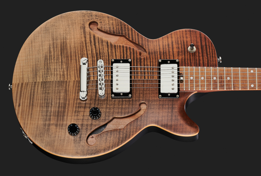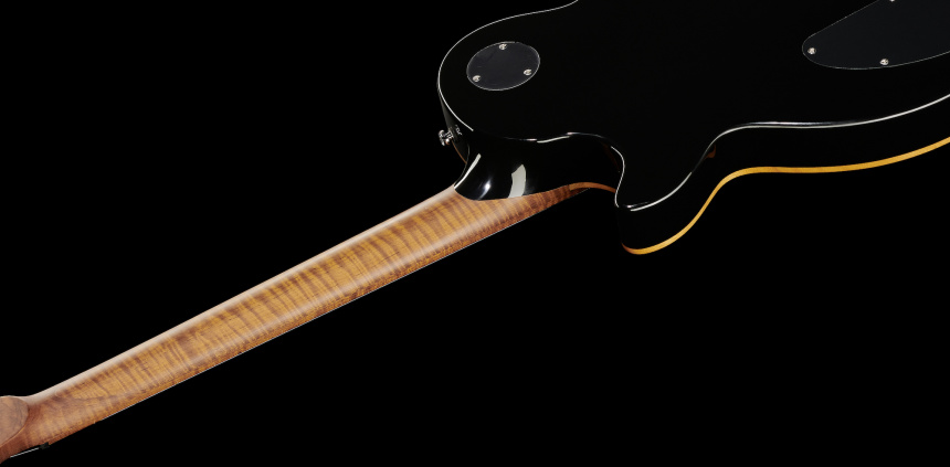 Disponible en acabados Bengal Flame con brillo o Frost Flame satinado, esta single-cut tiene un cuerpo de Caoba con una chapa (veneer) de Arce flameado AAA en la tapa delantera con las clásicas ƒ y una trasera de color negro.