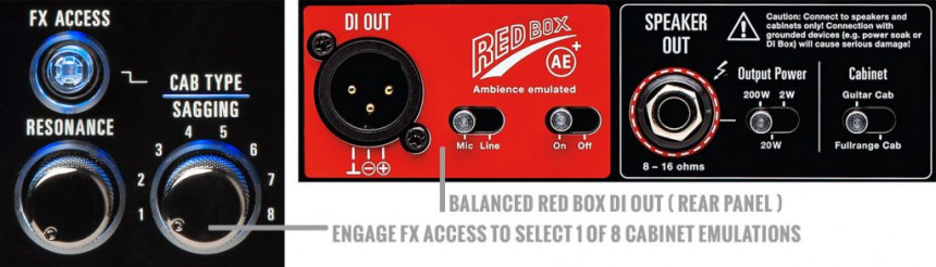 Las novedades destacadas que ofrece el Black Spirit 200 son las de poder conectar la salida de altavoz a todo tipo de pantallas de guitarra, monitores pasivos tipo FRFR, e incluso altavoces hi-fi. Y gracias a la Red Box AE+, la ultima generación de su conocida caja de inyección que ahora ofrece 8 simulaciones de altavoz, podemos enviar la señal a ordenadores, mesas de mezcla, sistemas in-ear, pantallas autoamplificadas, monitores, etc.