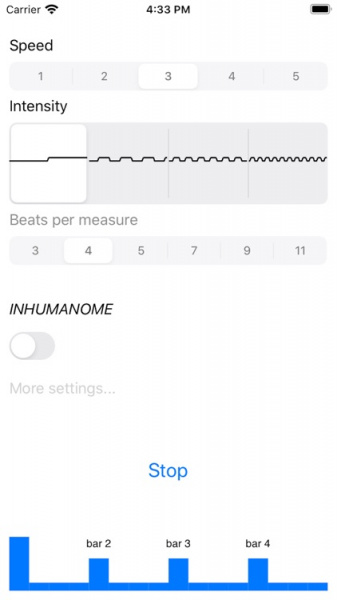 Los ajustes de la app nos permiten determinar la velocidad de 1 a 5; la intensidad con la que el tiempo va a fluctuar; los tiempos por compás con el primer tiempo acentuado (esto es opcional), o los compases que tendrá cada frase. Finalmente cuenta con un modo Inhumanome que crea sesiones con cambios más extremos con 4 intensidades adicionales.