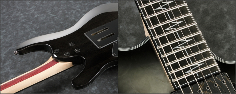 El mástil es de 3 piezas de Arce/Purpleheart/Arce con un diapasón de Ébano con radio de 15.75" y marcadores laterales fosforescentes de Luminlay. Mientras que el inlay diseñado por Nita es un gráfico de un electrocardiograma con los latidos del corazón a lo largo de todo el diapasón.