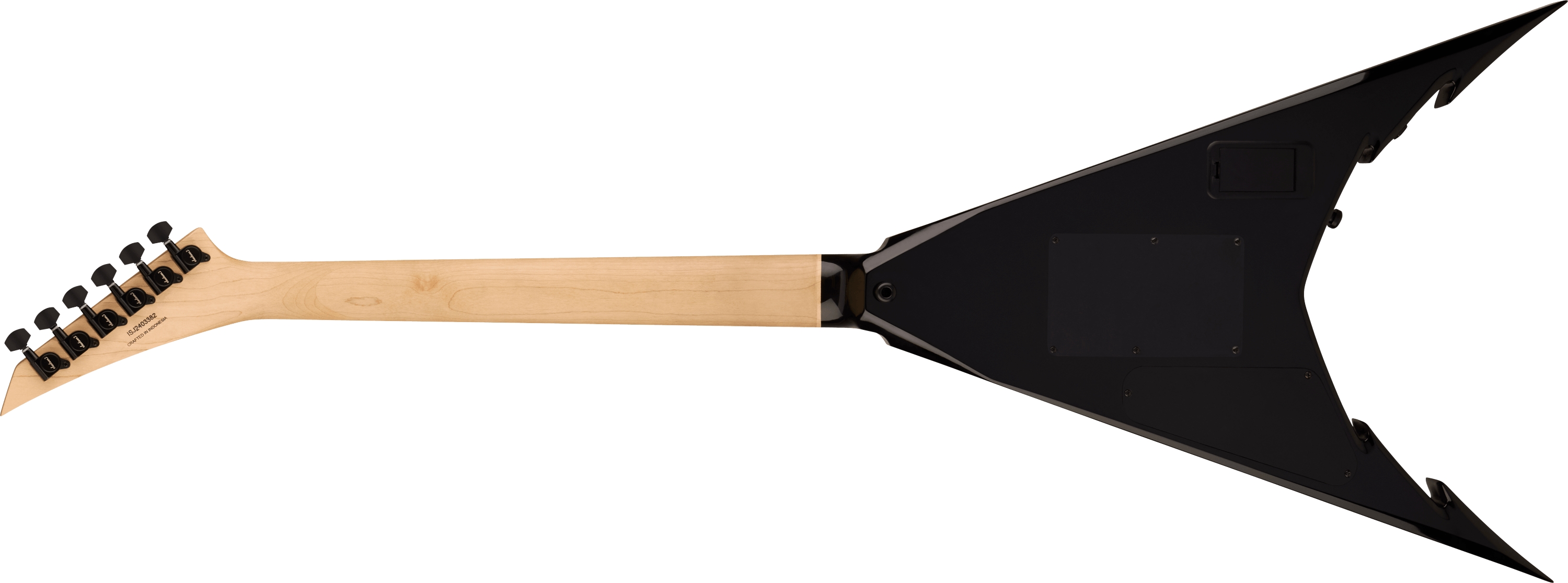 El mástil construcción a través del cuerpo es de arce con refuerzos de grafito, escala de 25.5", diapason de ébano, 24 trastes Jumbo, radio compuesto 12"-16", inlays de aleta de tiburón, y afinadores Jackson.