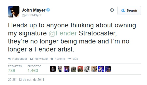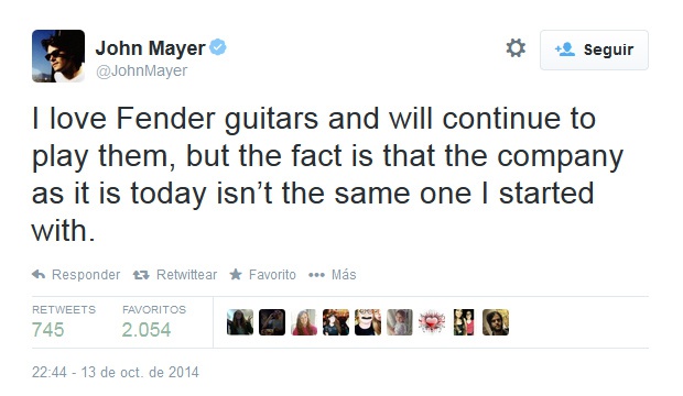Así expresaba ayer John Mayer desde su cuenta de Twitter su desacuerdo con Fender. Una pena si realmente el modelo deja de producirse, pues es uno de los que más valoran los usuarios en cuestión de relación calidad-precio.