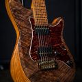 Ya en lo que respecta a la electrónica, tenemos una humbucker Seymour Duncan Whole Lotta en puente y dos single-coil Kiesel S60 en centro y mástil, con potenciómetros de volumen y tono y un selector de cuchilla de 5 posiciones. Todo ello montado en un golpeador multicapa estilo carey de color rojo.