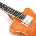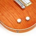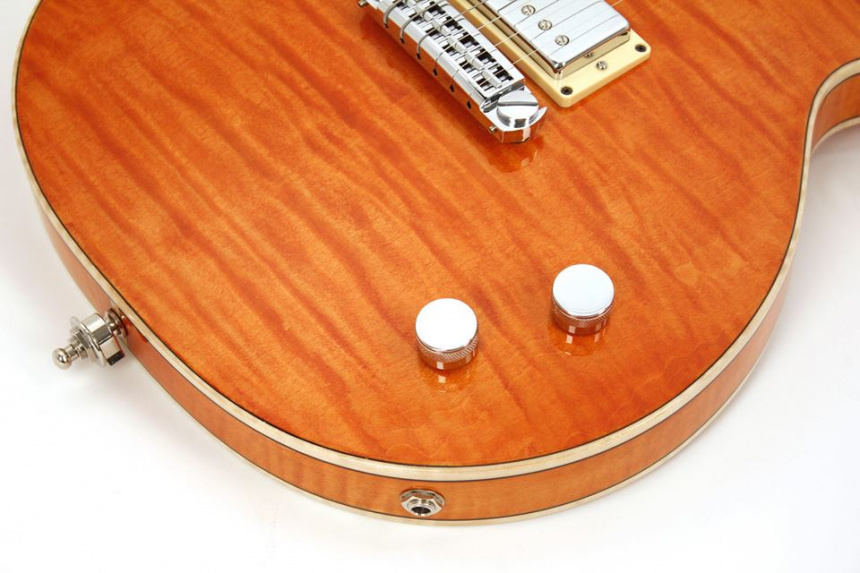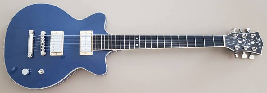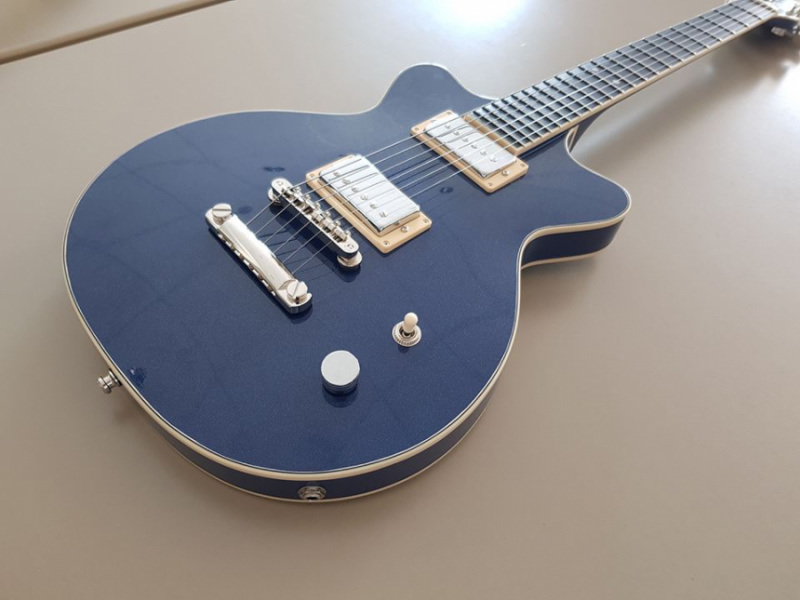 Mientras que la otra, a la que han denominado como modelo Leader Professional, es de color azul oscuro con un discreto acabado tipo purpurina; tiene pala de 3+3; puente tipo Tune-O-Matic con cordal, y un único control de volumen además del selector de pastillas de 3 posiciones.