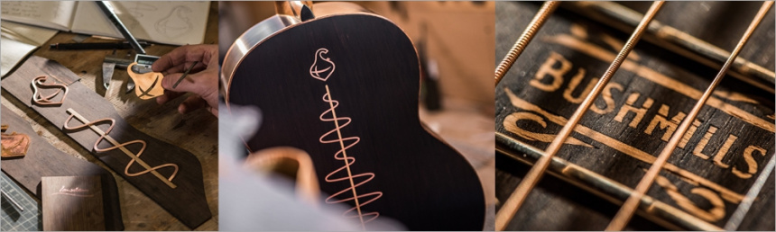 El toque exclusivo lo pone una inserción en la tapa trasera hecha con el Cobre proveniente de 10 alambiques usados en la elaboración del whisky, combinado con madera de los toneles empleados durante siglos para que repose la bebida. Esa misma madera es la que se ha usado para el inlay del traste 12. También se ha utilizado cobre en los marcadores laterales del mástil y en el logo de la pala.