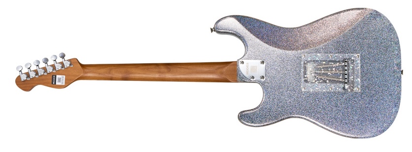 La nueva Mooer MSC50 Pro tiene un cuerpo de aliso (en lugar del álamo de la anteriores), que llega con un color Magic Crystal tipo glitter o purpurina. Un acabado muy funky que no desentonaría en las manos de un guitarrista como Nile Rodgers, sobre todo por el detalle del golpeador transparente, a juego con la tapa trasera.