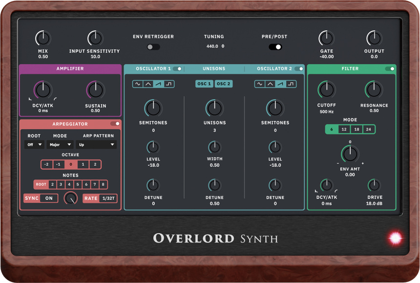 Pero el plato fuerte de Archetype: Rabea es el monosinte Overlord de síntesis sustractiva y doble oscilador con arpegiador y filtros incorporados, que permite disparar con la guitarra todo tipo de sonidos sintetizados sin necesidad de usar teclados, convertidores en hardware o programación MIDI, y por lo que parece, con un excelente seguimiento de nota.