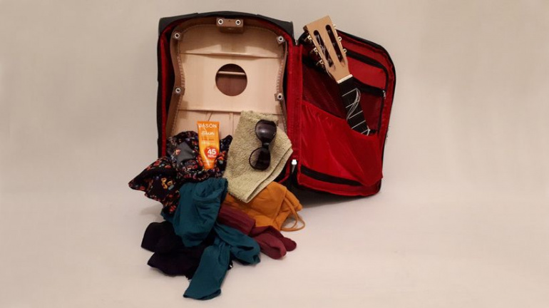 La gracia del asunto es que el cuerpo de la guitarra permite alojar tanto el mástil, que por cierto es multiescala con trastes en abanico, como la ropa, ordenador, tablet, o cualquier ítem que llevaríamos en una maleta de mano o mochila.