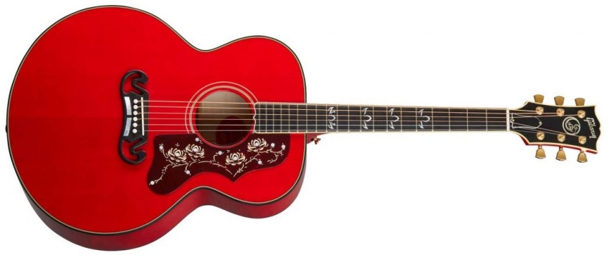 Una electro-acústica que combina el cuerpo del clásico modelo SJ-200 de Gibson, con la misma construcción de fondo y aros de Arce con tapa de Abeto Sitka AAA, pero con un acabado rojo Cherry y detalles exclusivos como su logo en la pala, o las flores de Loto en el golpeador y en los inlays del diapasón.