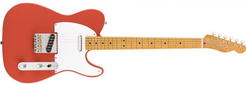 Cuerpo de Aliso con acabados 2 Tone Sunburst, Fiesta Red y Sonic Blue. Mástil y diapasón de Arce con perfil U y radio de 7.25”, puente estilo vintage con 3 selletas de latón, y pastillas con bobinado estilo años 50.