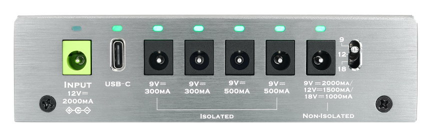 - 1 salida con voltaje conmutable 9V/2000mA, 12V/1500mA, 18V/1000mA para alimentar efectos con alto consumo y unidades multi-FX.
