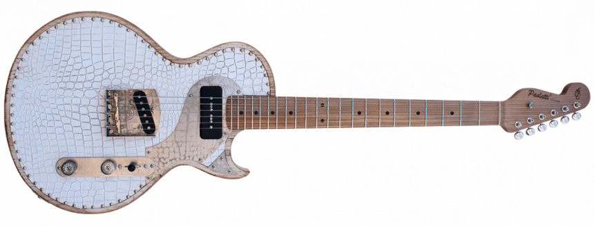 Sobre el cuerpo de madera de castaño tiene un recubrimiento de cuero blanco italiano simulando la piel de cocodrilo y rematado con tachuelas, adornado con un golpeador y placa de controles de latón con un grabado similar.