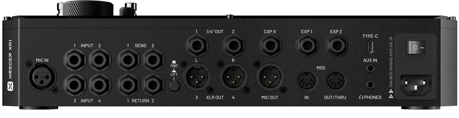 La conectividad tiene buen aspecto. Cuenta con salidas de 1/4", XLR, y tiene 2 sends y 2 returns (que supongo que se pueden convertir en un loop estéreo o 2 Mono), entrada de micro con Phantom y salida de micro XLR (inteligente, para poder mandar ese micro ya procesado por el X1 al técnico en el formato que suelen esperar), y una salida adicional de jack que parece que esté pensada para cuando creamos perfiles. Además, hay dos conexiones para pedal de expresión, MIDI y dos conexiones de 1/8" para Aux y auriculares.