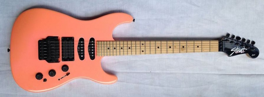 La pala a juego con el color del cuerpo exhibe el mismo logo de las HM Strat que Fender lanzó en los años 80 como respuesta a las Superstrats de otras marcas.