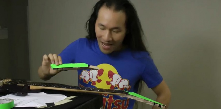 Seguramente había mejores maneras de hacerlo, para empezar quizá usando un poco de epoxi, pero ya sabemos lo que tarda en secar y hay que reconocer que para salir del paso, la reparación fue -al menos a primera vista- de lo más eficaz. Como podemos apreciar a Herman Li se le ve de lo más contento. Desde aquí mandamos un saludo a todos esos luthiers y técnicos que se encuentran día a día con marrones como estos.