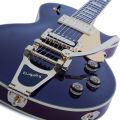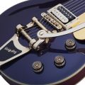 Centrándonos de nuevo en la guitarra, la Mark Thwaite es una variante del modelo de Schecter Solo II. Se trata de una guitarra inspirada en la Les Paul, con cuerpo de caoba y tapa de arce, combinada con un mástil hecho de tres piezas de caoba y refuerzos de fibra de carbono. La construcción es encolada y presenta una escala 24’74”. En el aspecto decorativo, la guitarra lleva inlays de madreperla en forma de bloque a lo largo de su diapasón de palo rosa de 22 trastes Extra-Jumbo y un binding multicapa de color crema. El acabado escogido ha sido el llamado “Ultraviolet”, un vistoso color lila que parece variar según la luz. Todo ello ha sido complementado por el puente Bigsby de color dorado, a juego con el resto de herrajes.