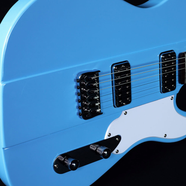 Una guitarra tipo Telecaster con cuerpo de álamo y la parte central elevada al estilo Gibson Firebird, con un diseño que recuerda a la Reverend Gristle 90, la signature de Greg Koch.