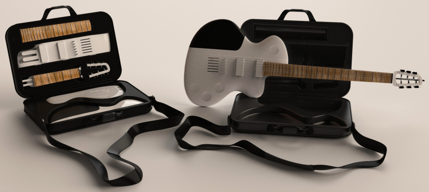 Una guitarra modular que una vez desmontada en sus 5 piezas (3 para el cuerpo y dos para el mástil) cabe en un pequeño maletín de 45,5 cm de largo por 10cm de ancho, y puede ser montada de nuevo en 20 segundos con un sistema de palanca que vuelve a recuperar la misma tensión de las cuerdas "sin apenas tener que retocar la afinación", según dicen sus creadores. Una vez montada mide 94,5 cm de largo y el mástil tiene 24 trastes y una escala estándar de 25.5".