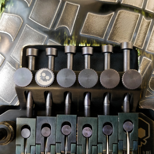 El vibrato es un Floyd Rose de la compañía "Kiss my strings", que como el resto del hardware también tiene un acabado abrasivo Sandblasted. Y finalmente en la electrónica monta un par de pastillas Fishman Fluence (humbucker en puente y single-coil en mástil), controladas por un selector deslizante de 3 posiciones y un único potenciómetro de volumen Push/Pull para alternar los dos modos de la humbucker. Un mini interruptor de palanca activa los Led del mástil.