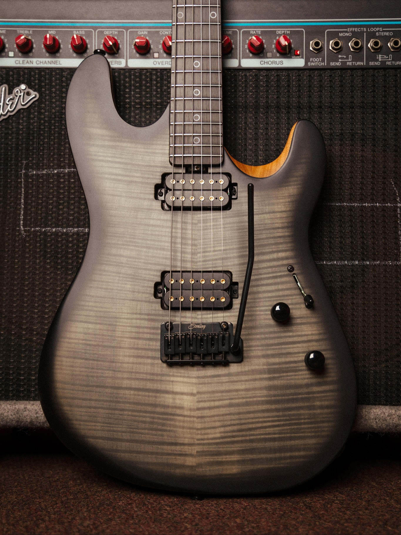 El mástil atornillado es de arce tostado con escala 25.5”, ajuste del alma en el talón, 22 trastes, diapason de ébano con inlays de anillos blancos, puntos laterales que brillan en la oscuridad, radio de 12", y afinadores con bloqueo.