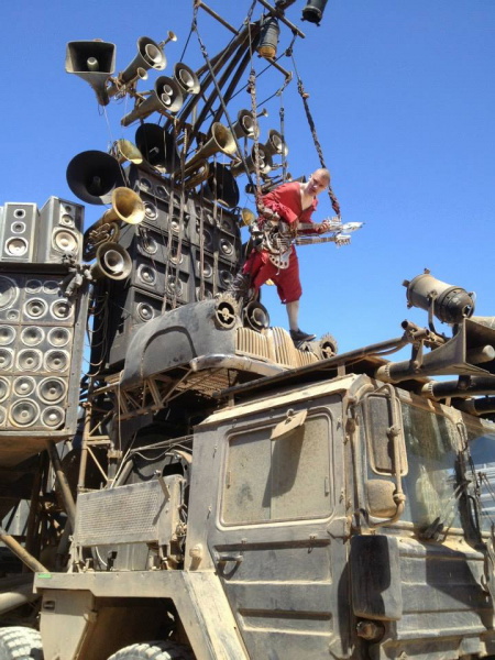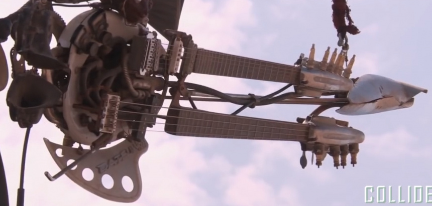 Por supuesto el "Doof Wagon" incluye la guitarra/bajo lanzallamas de doble mástil que tocaba uno de los guerreros mientras se balanceaba colgado de cuerdas elásticas.