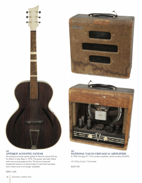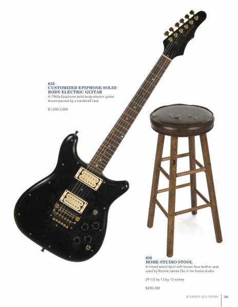 La colección Property From The Estate of Ronnie Dio incluye ropa de calle y escenario, muebles, espadas y otras armas medievales, documentos personales como el pasaporte o el carnet de conducir, discos de oro y platino de sus etapas en solitario y con bandas como Rainbow y Black Sabbath, sintetizadores, pianos y un teclado Mellotron de los años 70, además de equipo de P.A. incluyendo torres de sonido, etapas de potencia, monitores, micrófonos, mesas de mezcla, cajas de transporte, y hasta la enorme cabeza de dragón articulada de la gira Sacred Heart en el 85, o la araña robótica vista en el Dio Dream Evil Tour del 88.
