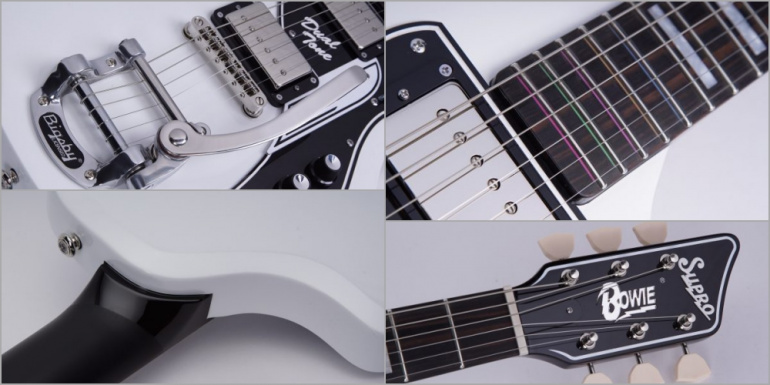 Ahora, y aprovechando la cita del NAMM, Supro ha presentado la David Bowie Limited Edition Dual Tone. Una guitarra basada en una de las dos Dual Tone del 61 que el músico británico compró en eBay a principios de 2003, y que después de ser modificada por el luthier Flip Scipio, quien le instaló un vibrato Bigsby y sustituyó los 5 últimos trastes por inlays de arce tintado con los colores del arcoíris, fue usada en la gira y posterior álbum “A Reality Tour”.