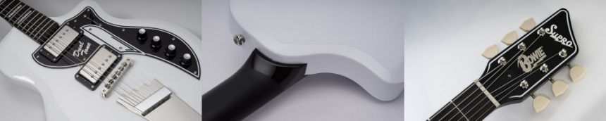 Otras características de esta nueva réplica son un cuerpo de Caoba con el característico acabado blanco; un mástil encolado de Arce con diapasón de Pau Ferro y el logo de Bowie en la pala; escala de 24 ¾”; radio de 12"; y un par de pastillas Vistatone fabricadas por la compañía Roadhouse con las mismas especificaciones que las Valco originales. En los controles tenemos selector de 3 posiciones y potenciómetros de volumen y tono para cada pastilla.