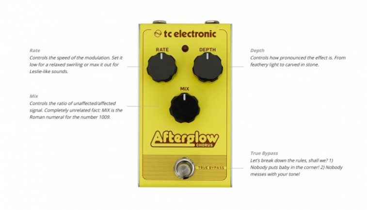 [Índice]Los dos primeros en aparecer por el facebook de TC Electronic fueron el chorus Afterglow y el delay Echobrain. Ambos están basados en el chip Bucket Brigade, ofreciendo el primero un chorus de carácter vintage y un delay de sonido clásico el segundo, y pudiendo alcanzar un tiempo de retardo total de 300ms. Usando el mismo tipo de tecnología, el nuevo pedal de vibrato TailSpin entrega sonidos ondulantes que van desde oscilaciones lentas que emulan un disco rayado a imitaciones de altavoz rotatorio, y el Thunderstorm hace lo propio en el espectro de sonidos de flanger analógico.