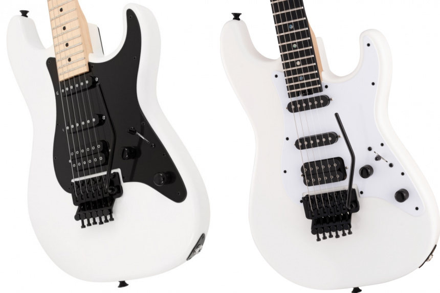 Por lo demás ambas son idénticas con un cuerpo de Aliso con acabado blanco Snow White; un mástil de Arce con refuerzos de Grafito, escala 25.5", pala Stratocaster con licencia Fender, 22 trastes Jumbo, y radio compuesto de 12”-16”; un vibrato Floyd Rose Original con doble bloqueo, y en la electrónica su acostumbrada combinación de pastillas DiMarzio con una humbucker Super Distortion DP100 en puente y un par de single-coil Samarium Cobalt Noiseless en centro y mástil.