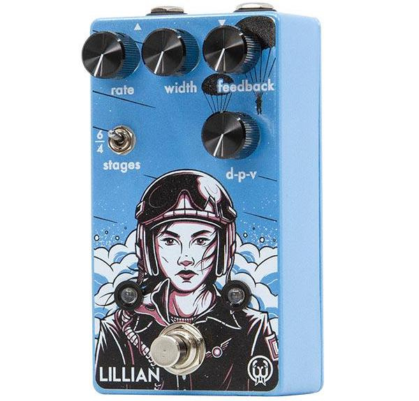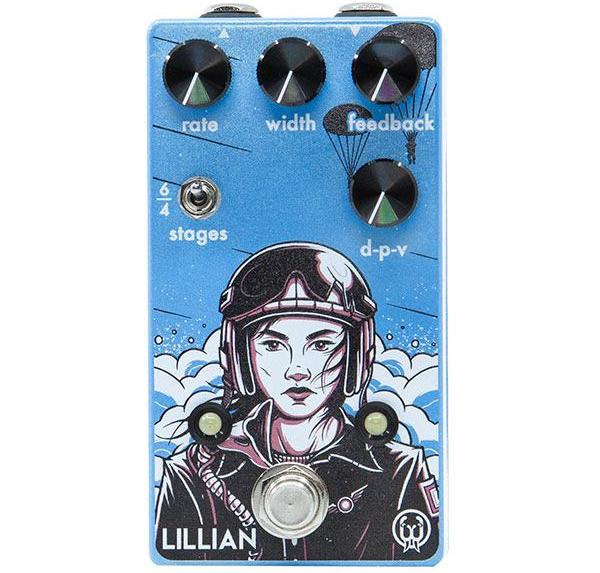 También con nombre femenino, Lillian es en esta ocasión un versátil efecto de Phaser totalmente analógico y multi etapa, que además de los controles habituales de Rate, Width, y Feedback (frecuencia, profundidad de la modulación y realimentación), cuenta con un selector de dos posiciones para elegir 4 o 6 etapas –la primera nos proporciona un efecto de Phaser más cálido y la segunda un filtro más exagerado–, y un potenciómetro rotulado como d-p-v (Dry-Phase-Vibrato).