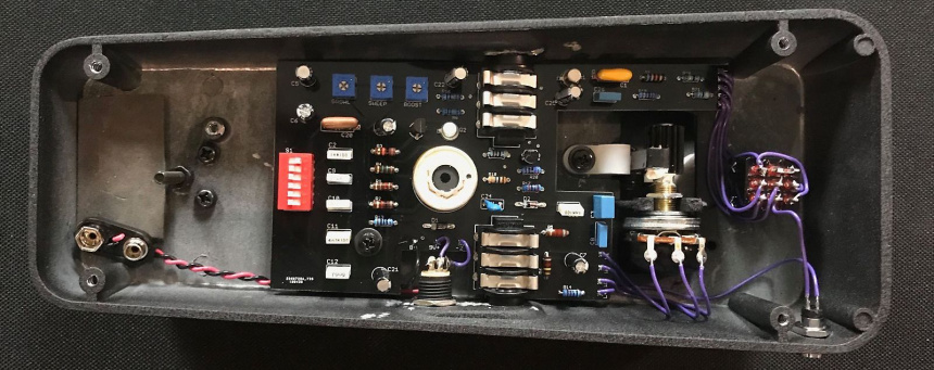 Por lo visto algunos guitarristas prefieren no tener tantos controles en el exterior de la carcasa, y Wilson Effects ha decidido ofrecer esta nueva versión con todos los ajustes en el interior. De forma que ahora tenemos 3 pequeños Trim Pot en lugar de los potenciómetros de Growl, Sweep y Boost, y seis micro conmutadores tipo Dip sustituyendo el selector rotatorio de 12 posiciones.