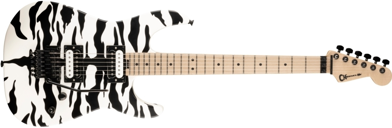 La Charvel signature del guitarrista Russ “Satchel” Parrish para 2022 llega con un cuerpo estilo Dinky de aliso con acabado atigrado Satin White Bengal; un mástil atornillado de arce con refuerzos de grafito y radio compuesto 12”-16”; vibrato Floyd Rose 1000 Series; y un par de humbuckers Fishman Fluence Classic PRF-CHB con un potenciómetro de volumen push/pull para alternar entre los dos modos de estas.