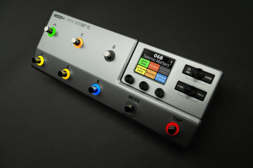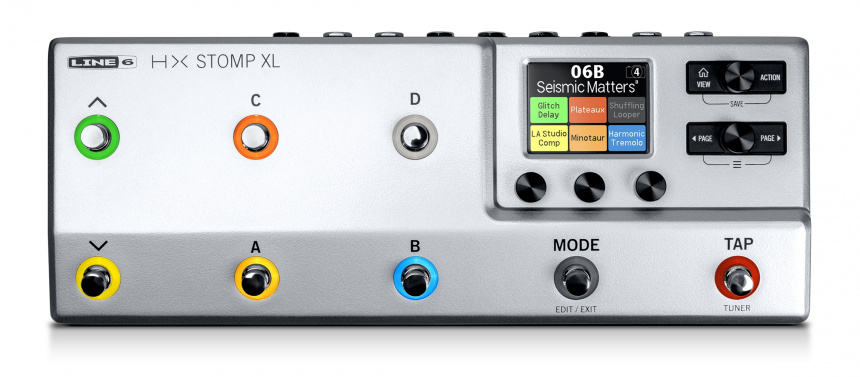 El HX Stomp XL tiene decenas de simulaciones de amplis, pedales de distorsión, modulaciones, delays, reverbs, wah, pitch shifting, filtros y casi cualquier categoría de efectos imaginable. Cuenta con salidas y entradas estéreo, así como un loop de efectos programable que tanto puede funcionar como un solo loop estéreo como dos loops mono. Su pantalla a color nos permite crear presets de hasta 9 bloques de efectos simultáneos, y sus 8 pulsadores capacitivos (significa que detectan el tacto del dedo) y con retroiluminación LED de colores nos permite tanto seleccionar presets como escenas o efectos individuales, además de navegar por sus diferentes opciones, como el afinador incorporado o el Tap Tempo.