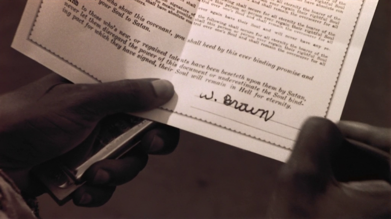 Pero quizá el motivo sea lo más simple: sencillamente tiene miedo a enfrentarse solo a su destino final; ¿no es un anciano a su vez un niño asustado en su trayecto final? Porque si algo queda claro en la película en más de una ocasión es que no tiene ningún interés en que otro firme un pacto como el suyo —aunque esa decisión no le pertenezca— y el terror se apodera en su rostro sólo con mencionar cualquier referencia a él. Y también son reveladoras esas pesadillas, que deducimos recurrentes, que nos muestran ese miedo constante a la incerteza de cuando será el día que alguien se presente a reclamar ese alto precio pactado por sus posiblemente escasos momentos de gloria. O peor aún, terminar de forma drástica como su amigo Robert Johnson, quizá asesinado, como cuentan algunas de las leyendas sobre su persona.