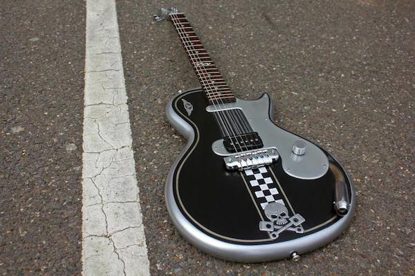 Por otra parte Hutchinson también ha mostrado la Cafe Racer un modelo inspirado en el estilo de motos del mismo nombre muy popular en los años 50. Como base ha usado una Gibson Melody Maker actualizada con clavijeros Schaller cromados y un puente Gotoh buscando la esencia simplista de estas viejas motos de carreras.