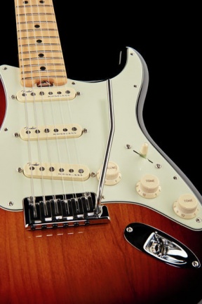 [Índice]Al igual que su hermana de la serie que ya pudimos probar en su momento, la Telecaster Thinline, la Stratocaster American Elite presenta un aspecto impecable. La verdad es que ya estamos muy acostumbrados al aspecto de la Stratocaster, y la mayoría de los guitarristas la hemos podido ver en todas las gamas de precio imaginables, por lo que esta guitarra puede no impactar en un primer momento. Pero lo cierto es que está muy bien acabada y el brillo del barniz y los componentes metálicos es realmente lujoso. Es un modelo conservador con la imagen tradicional de la Stratocaster, y sólo dos elementos se apartan ligeramente de la estampa que todos tenemos en nuestra memoria: uno es el talón recortado de la unión del cuerpo y el mástil (que está justificado con su función de hacer la guitarra más cómoda) y el otro es la decoración de las pastillas con el logo de fender (que nos resulta redundante) y el nombre del modelo. A nosotros no nos convence la presencia de tal inscripción, y es algo que ya destacamos en la Telecaster Thinline. Por supuesto, sería un motivo ridículo para no considerar esta guitarra, se trata simplemente de un apunte estético que seguramente tenía como finalidad subrayar el hecho de que esta gama incorpora las nuevas Noiseless de 4a generación.